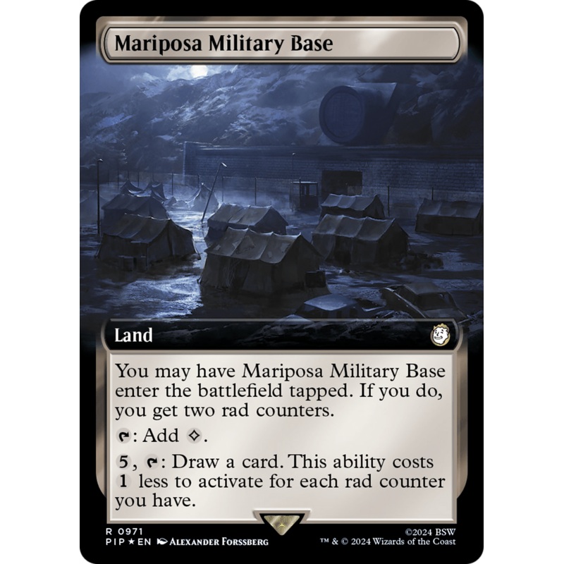 Set: Fallout Type: Land Rarity: Rare You may have Mariposa Military Base enter the battlefield tapped. If you do, you get two rad counters.{T}: Add {C}.{5}, {T}: Draw a card. This ability costs {1} less to activate for each rad counter you have.
