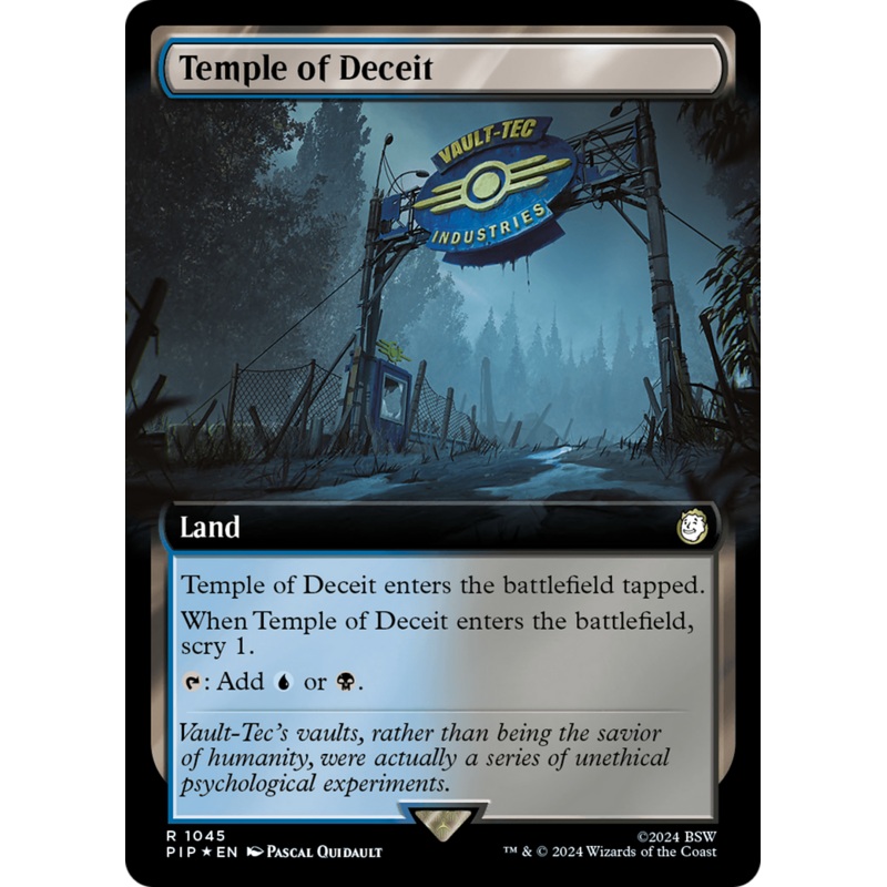 Set: Fallout Type: Land Rarity: Rare Temple of Deceit enters the battlefield tapped.When Temple of Deceit enters the battlefield, scry 1.{T}: Add {U} or {B}. Vault-Tec's vaults, rather than being the savior of humanity, were actually a series of unethical