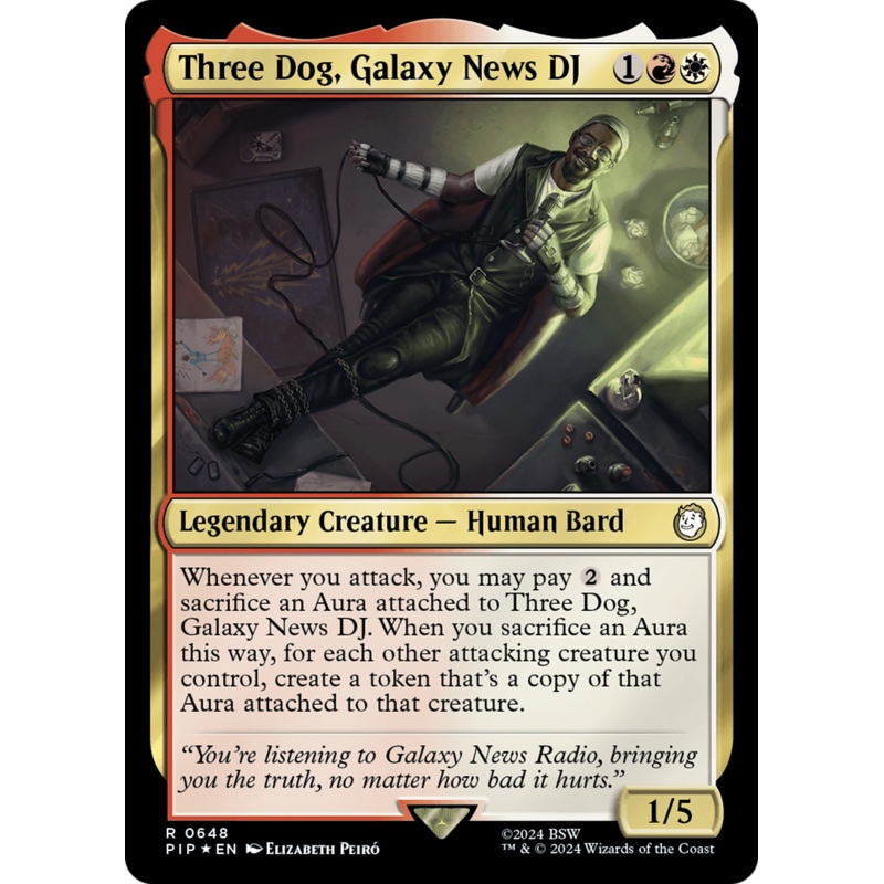 Whenever you attack, you may pay {2} and sacrifice an Aura attached to Three Dog, Galaxy News DJ. When you sacrifice an Aura this way, for each other attacking creature you control, create a token that’s a copy of that Aura attached to that creature. You’re listening to Galaxy News Radio, bringing you the truth, no matter how bad it hurts.
